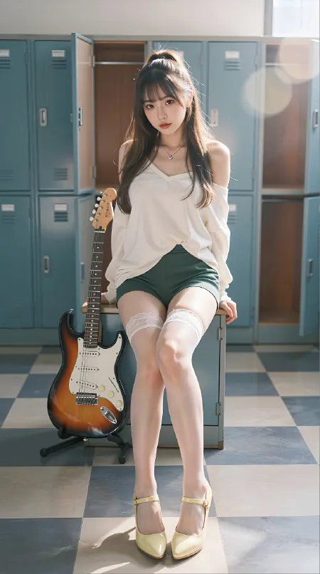 1girl,solo,asian woman,Japanese idol face,smooth and fair skin,long ombre brown hair,soft bangs,a ponytail,delicate features,curvy,perfect female body, slender legs, toned legs with curves,gigantic breasts.