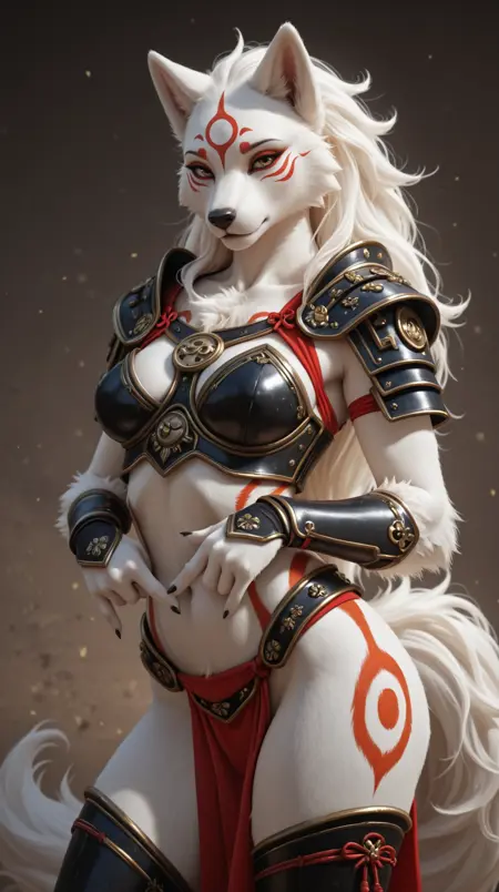 source_furry, masterpiece, best quality, 1girl, female anthro amaterasu, furry, furry female, fluffy fur, fluffy, medium breasts, armor, sexy pose, flirty, source_photorealistic
