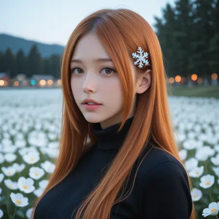 masterpiece,best quality,amazing quality,very aesthetic, HDR, high contrast, solo, 1girl,inoue_orihime, brown eyes, orange_hair, long_hair, parted_bangs, hair_ornament, large breasts, depth of field, blurry background, white background, upper body, hair ribbon, red ribbon, black sweater, black turtleneck, parted lips, looking at viewer, outdoor, night, open field, white theme, white petals