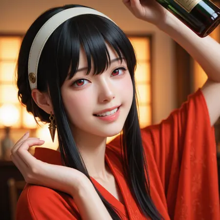 yor briar, black hair, red eyes, sidelocks, hairband, short hair with long locks, white hairband, solo, cute, 1girl, open smile, smile, celebration, holding champegne bottle, incredible quality, highest quality, high res, absurd res, drunk, light blush, crazed face, raised arm, celebratin, dynamic, great quality, amazing quality, masterpiece,cinematic lighting , cinematic angle, soft light , color detail, backlighting, Depth of field, long exposure, light steps, intricate colors, vibrant colors, new year, The text reads HAPPY 2026 ,yor briar, black hair, red eyes, earrings, white hairband, hairband, long hair, sidelocks,