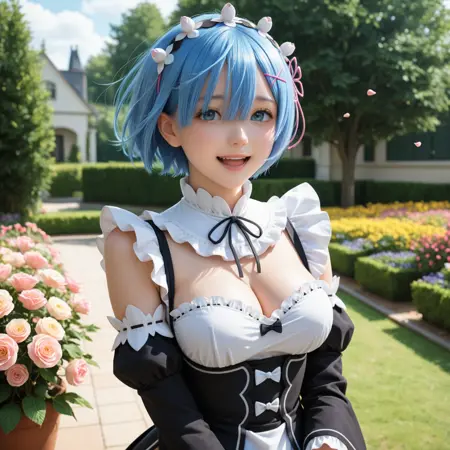 masterpiece, best quality, highres, aarem, short hair, maid headdress, x hair ornament, hair ribbon, large breasts, frills, neck ribbon, cleavage, dress, detached sleeves, <lora:rem_v1:0.8>, (upper body:1.2), (smile:1.1), open mouth, (floating hair:1.1), (wind:1.1), garden, (Rem ã¬ã / Re:Zero),