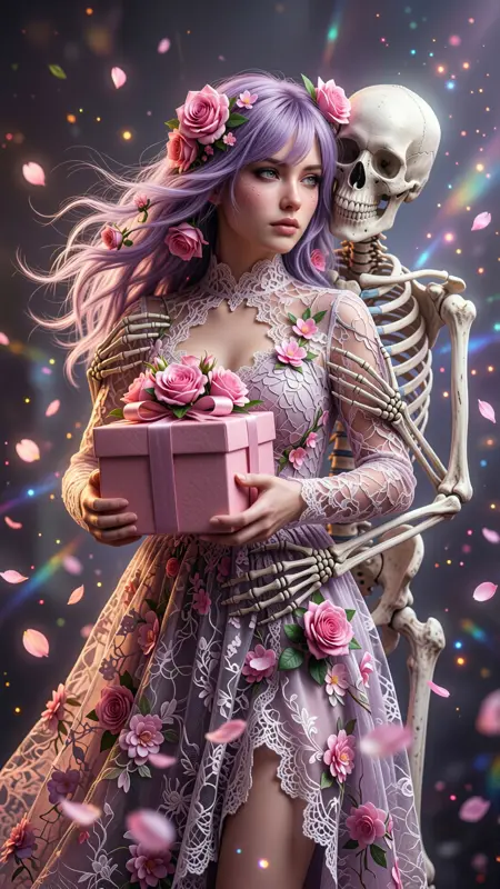 Aesthetic female with lavender hair adorned with pink roses, wearing a delicate lace dress with floral patterns, holding a pink gift box tied with a ribbon and decorated with small flowers. A white skeleton gently embraces her from behind, its bones interwoven with her hair, creating a surreal yet harmonious composition. Cinematic lighting bathes the scene in soft, ethereal glow, casting gentle shadows and highlighting the intricate details of her attire and the skeletal structure. The background is a muted lavender hue, enhancing the dreamlike, otherworldly atmosphere. Full-body composition, capturing the contrast between life and death in a visually striking and emotionally evocative manner