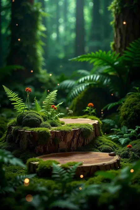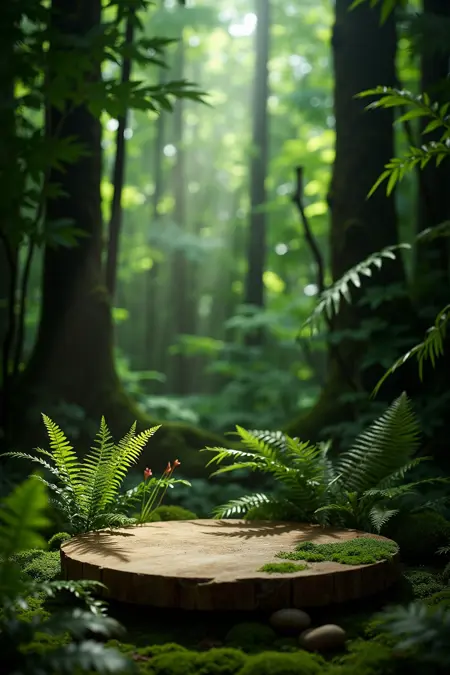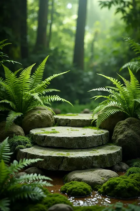 - Lush green forest scenes with platforms, use weathered stone platforms, scatter small ferns, gentle stream nearby, for natural skincare showcase.