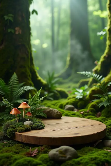 - Lush green forest scenes with platforms, make round wooden platforms, adorn with tiny mushrooms, foggy forest air, suit handicraft display.