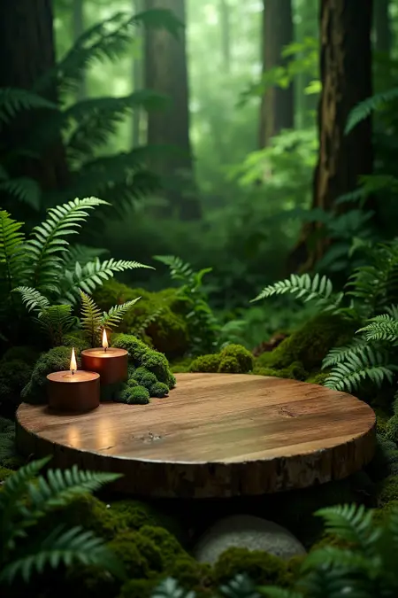 - Lush green forest scenes with platforms, set rustic wooden platforms, surround with dense ferns, dim light, good for candle product promo.