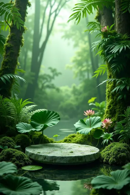 - Lush green forest scenes with platforms, include crystal – clear pond near platforms, lotus leaves floating, pure for beauty product display.