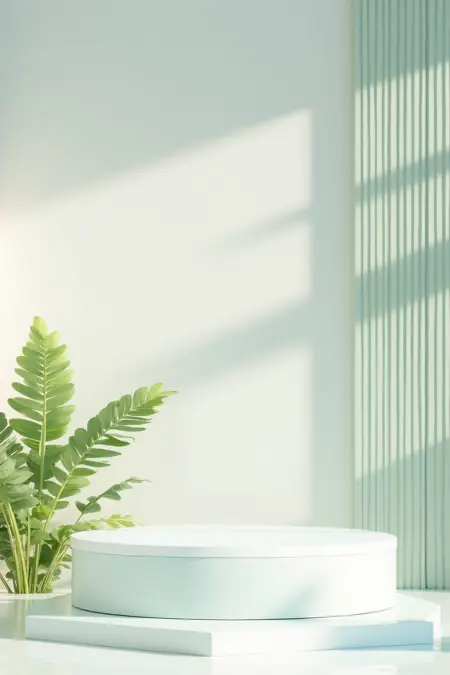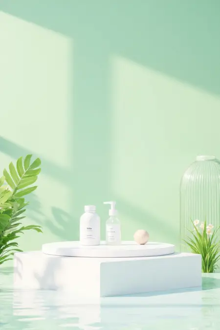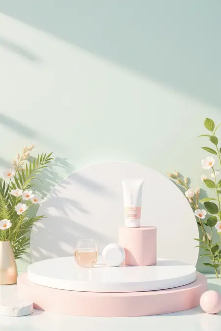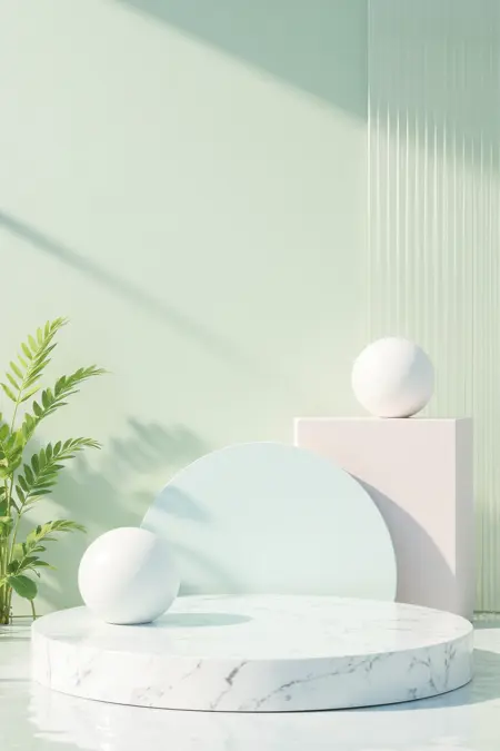 - Soft pastel tones and natural elements, build a 3D showcase. Include light – blue backdrops, water surfaces, potted plants, and marble – like platforms for a tranquil vibe.