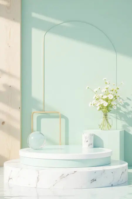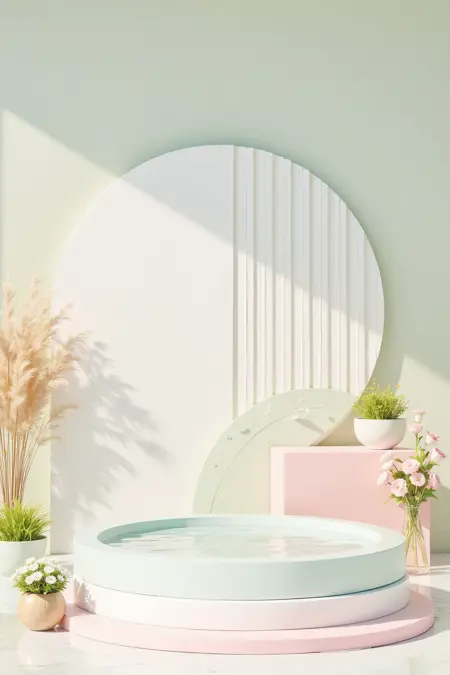 - Soft pastel tones and natural elements, design a 3D presentation space. With mint – green backgrounds, water features, flower vases, and minimalist platforms for elegance.