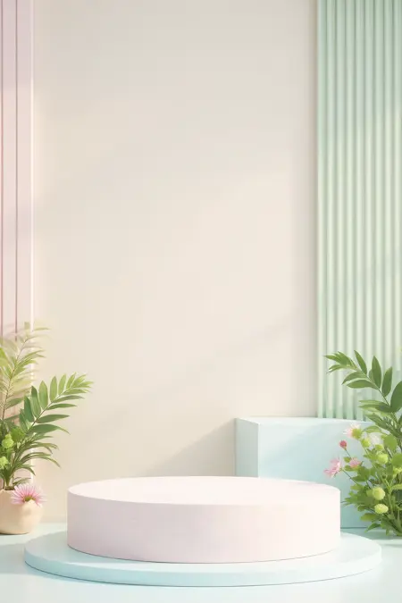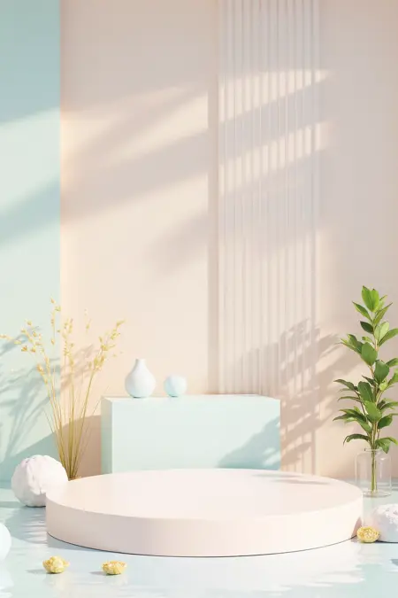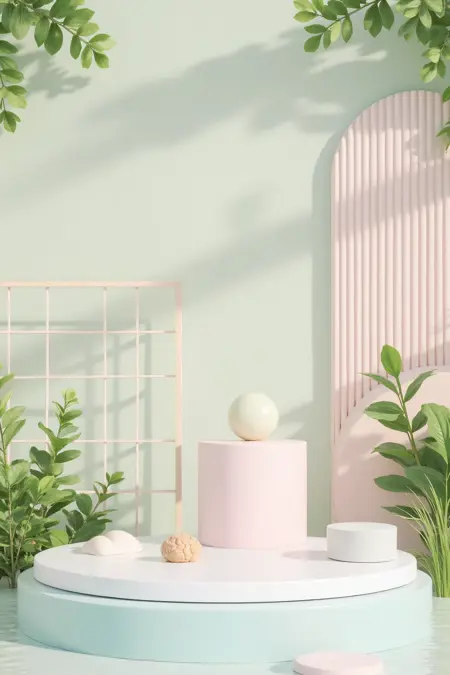 - Soft pastel tones and natural elements, craft a 3D product stage. Use light – toned structures, water, greenery, and geometric frames to highlight items softly.