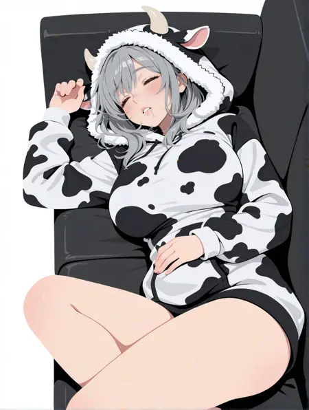 cow print, drooling, hood, hoodie, blush, parted lips, 1girl, white background, closed eyes, fur trim, hood up, long hair, animal ears, sleeping, grey hair, large breasts, horns, medium hair, fake horns, simple background, solo, animal print, cow horns, cow ears, lying on sofa, foot,