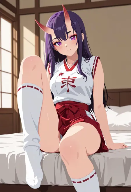 (oni-girl), solo, japanece uniform, (dresssed long sock, sitting on bed)