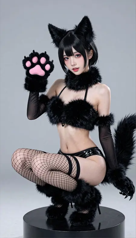 Create a full-body shot of an Asian cosplay girl as a black wolf/fox neko character, squatting on a black pedestal. She wears black cat ears, a fluffy black fur collar and cuffs, black furry paw gloves with pink paw pads and black claws, black sheer arm sleeves, a black fuzzy tail, a black halter top with fur trim exposing her midriff, black micro shorts, black fishnet stockings, and black furry leg warmers. Her dark smoky eye makeup and glossy lips give her a playful expression. Set against a soft grey studio background, capture the scene with professional cosplay photography, emphasizing sharp details on the fur texture and a latex-like shine on her accessories. Render the image in an anime-inspired yet realistic style, at 8K and high resolution.