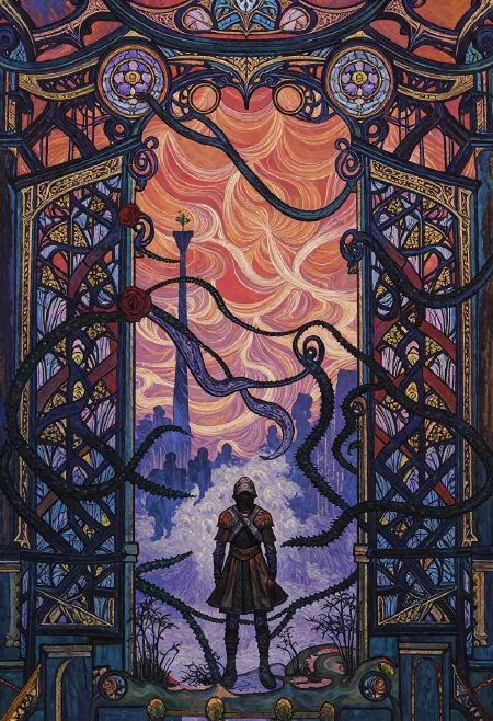 A tragic, symbolic scene unfolds like a visual poem of loss and inevitable destiny. A lone armored wanderer returns to a forgotten homeland, standing at the threshold of ruined gates overtaken by thorned vines and shattered stained glass. His posture is weary yet resolute, as if drawn forward by memories stronger than fear. Torn banners drift from collapsed towers, their faded heraldry barely visible beneath creeping decay. The sky above churns with mournful twilight hues, swirling clouds forming ornamental, flowing shapes reminiscent of art nouveau filigree, as if the heavens themselves mourn the fallen kingdom. Ghostlike silhouettes of past companions and lost loved ones emerge faintly within drifting mist, not hostile but sorrowfully distant, suggesting memories that refuse to fade. Elegant, curling organic motifsâwithered roses, fractured halos, and serpentine rootsâintertwine through the architecture and landscape, reinforcing dark romantic symbolism. The atmosphere balances beauty and tragedy, portraying return not as victory, but as confrontation with irreversible change. Rendered as an expressive, multi-layered painting influenced by expressionism and art nouveau aesthetics, the composition emphasizes pronounced texture and emotional movement. Thick impasto highlights clash with thin translucent glazes, while gestural brushstrokes carve motion into sky and fabric. Luminous vivid colors shift between mournful violets, burning ambers, spectral blues, and bruised crimson tones. Variations in brushstroke density create rhythm and visual tension, revealing traces of paint and artistic struggle. The scene captures a haunting moment of reflection, sacrifice, and acceptance, where the past and present merge into a sorrowful yet mesmerizing testament to memory and fate. purpl3gr1m, DBRZ <lora:Arcane_Violet:0.6> <lora:Z-DBRZ:0.6> <lora:Z-Detail-Slider:0.5>