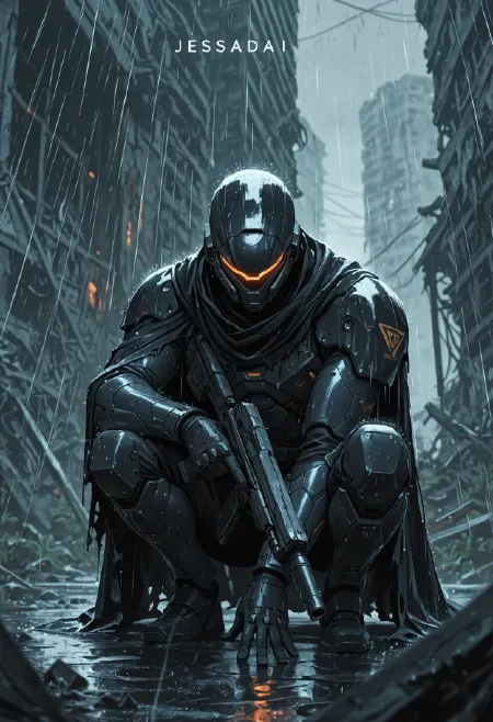 masterpiece, best_quality, 1boy, black_cloak, blurry, blurry_background, cloak, commission, english_text, gun, hand_on_ground, holding, holding_gun, holding_weapon, jessada_sutthi, male_focus, original, photoshop_medium, power_armor, rain, ruins, science_fiction, solo, squatting, torn_cloak, torn_clothes, weapon