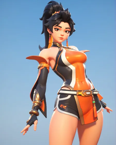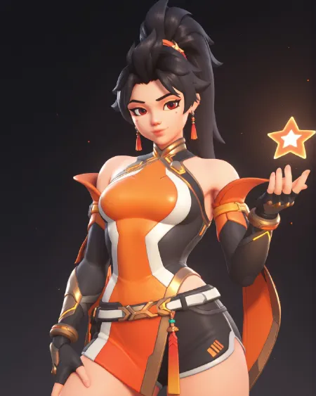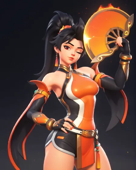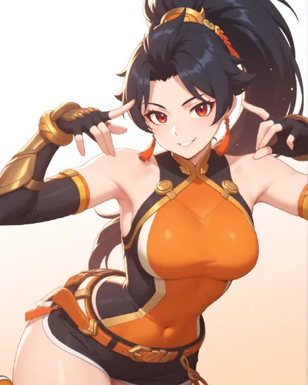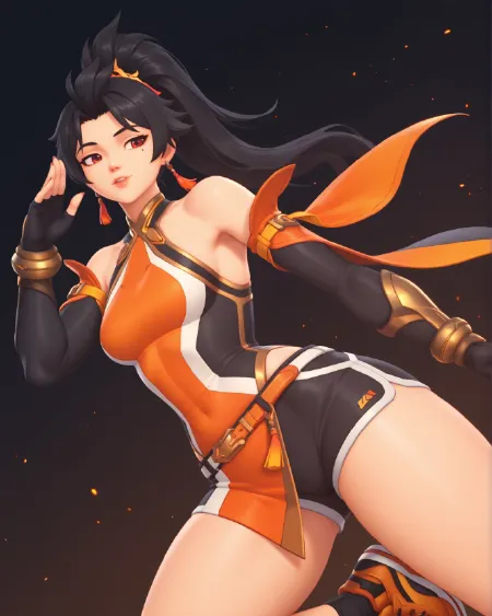 | 触发词: | anran_99, black hair, ponytail, long hair, red eyes fingerless gloves, gloves, orange footwear, shoes, bare shoulders, socks, jewelry, orange dress, earrings, shadow, hair ornament, sneakers, elbow gloves, belt, detailed skin, moles , black shorts hand fan |