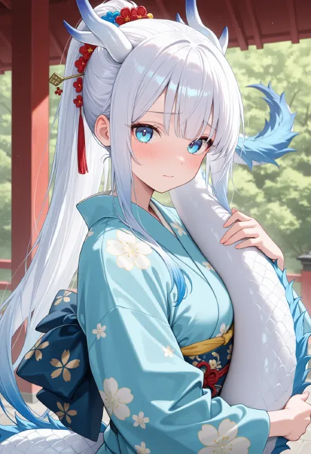 1girl, masterpiece, blue eyes, solo, horns, japanese clothes, kimono, tail, ponytail, white hair, looking at viewer, bangs, hair ornament, dragon girl, long sleeves, floral print, dragon tail, obi, long hair, dragon horns, wide sleeves, outdoors, hugging tail, shy, upper body,