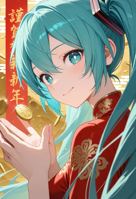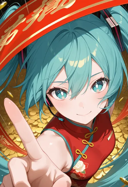 masterpiece,best quality,amazing quality,(close-up:1.4),Side body,perspective,diagonal composition,overlooking,portrait,1girl,hatsune miku,white pupils,Floating threads,abstract background,looking at viewer,red cheongsam,colorful,very long hair,ink silk thread,vertical screen,ink mountain,Turn back,perspective,smile,wind-swept hair,banner,both hands spread banner,energy,sense of impact,complex background,coin rain,copper money,new year,