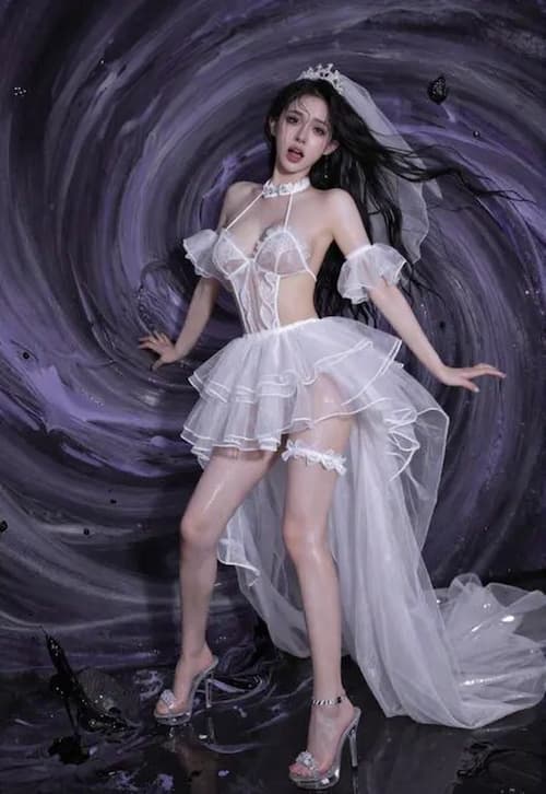 她身穿白色婚纱套装,白色丝袜,白色婚纱头巾, 蕾丝白色心形印花 ,穿同色系高级透明水晶高跟鞋.