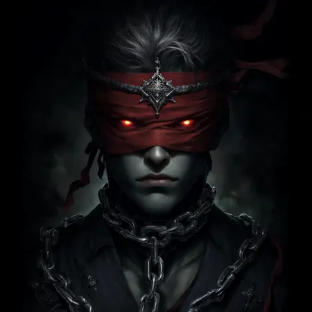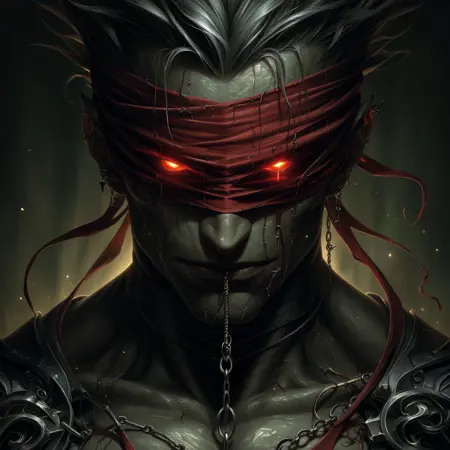 dnddarkestfantasy, The image shows a man with a red blindfold on his face wearing a metal object and chains around his neck with a dark background., 1boy, male focus, solo, chain, glowing, red eyes, glowing eyes, headband, colored skin, closed mouth