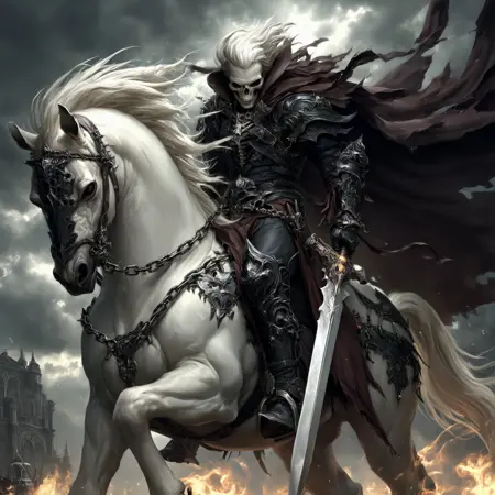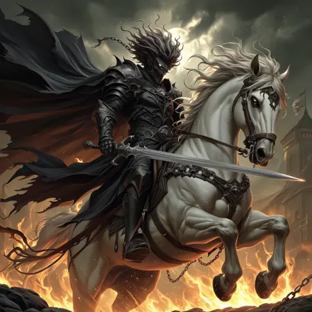 dnddarkestfantasy, The image shows a man riding on the back of a white horse with a skeleton in the background. The man is wearing a black outfit and the horse is adorned with a chain. The sky is filled with clouds and there is a building in the distance. The image is animated giving it a dynamic feel., weapon, riding, armor, sword, horseback riding, horse, holding weapon, holding sword, fire, cape