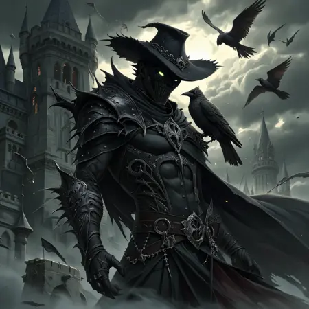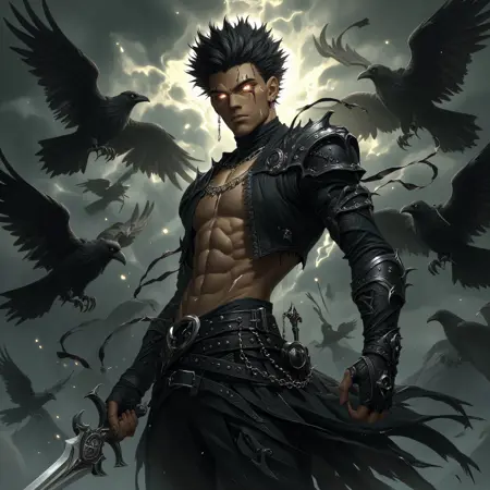 dnddarkestfantasy, The image shows a man with a sword in his hand standing in front of a cloudy sky with crows flying around him. He is wearing a black outfit and has a determined expression on his face. The image is animated giving it a dynamic feel., bird, 1boy, male focus, glowing eyes, glowing, cloudy sky, solo, weapon, abs, cloud
