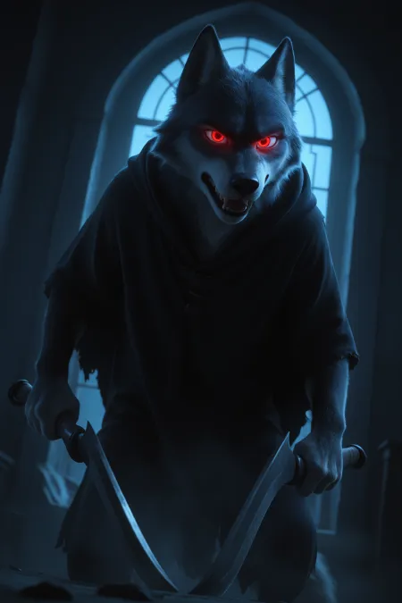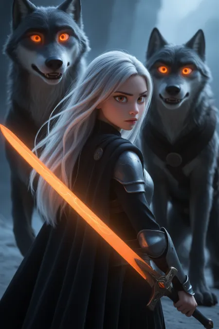 upper body, looking at viewer, 1girl, long hair, looking at viewer, holding, weapon, white hair, solo focus, looking back, sword, from behind, cape, holding weapon, armor, lips, orange eyes, glowing, animal, holding sword, glowing eyes, cloak, wolf, glowing weapon, glowing sword, dynamic pose, dynamic angle, masterpiece, best quality, amazing quality, very aesthetic, absurdres, highres
