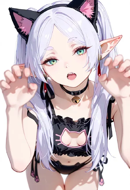 frieren, depth of field, cat lingerie, bra, cat ear panties, claw pose, thigh gap, thighs