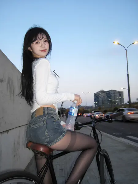 ccd,photograph of a young woman, Asian, long black hair, wearing glasses, white long-sleeve crop top, denim shorts, black sheer pantyhose, sitting on a black bicycle, holding a plastic water bottle, dusk, urban setting, concrete pathway, street with moving cars in the background, streetlights on, modern buildings in the distance, woman looking over her shoulder, slightly smiling, bicycle has brown leather seat, camera angle from the side, low angle, clear sky, soft blue evening light, slight reflection in the camera's viewfinder, casual style, modern cityscape, realistic, detailed, natural light, urban environment, everyday life, relaxed atmosphere, contemporary fashion.