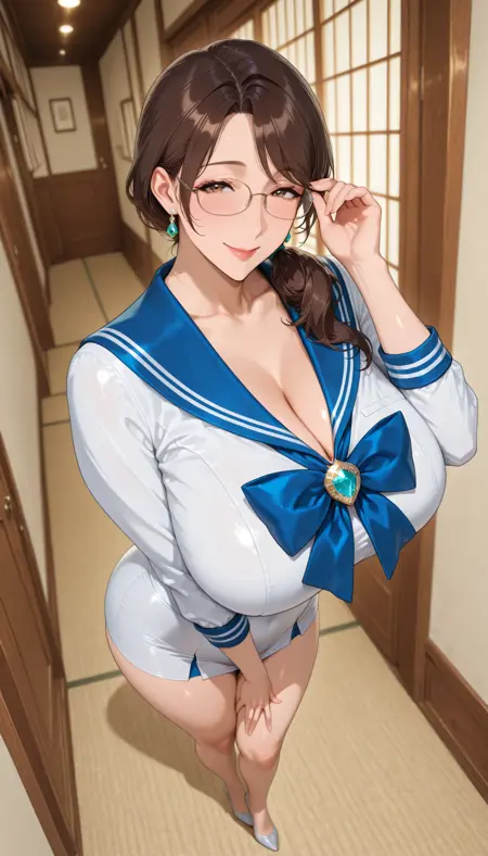 1girl,brown hair,low_side_ponytail,glasses,smile,dutch angle,large breasts,cleavage,sailor suit,earrings,gem,jewelry,solo,posing,full body,